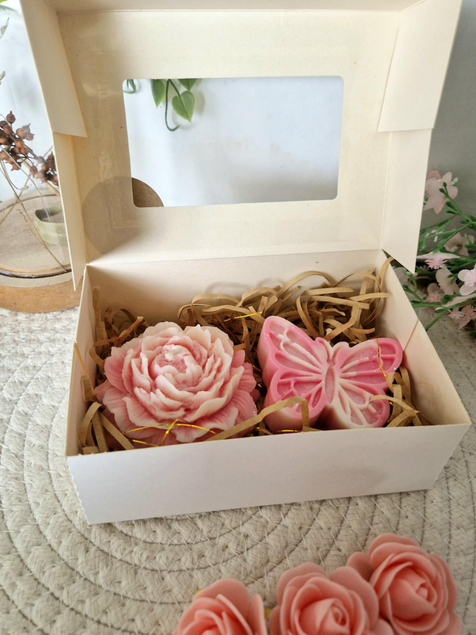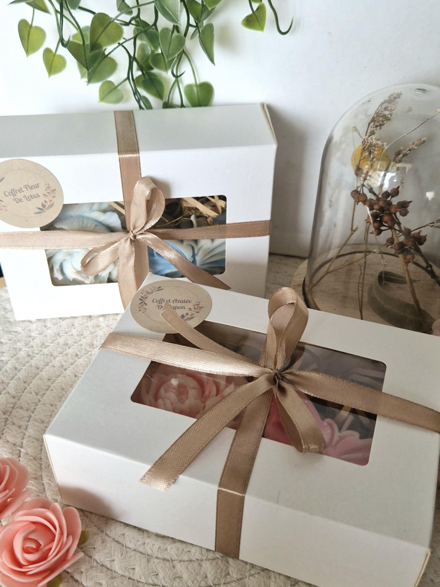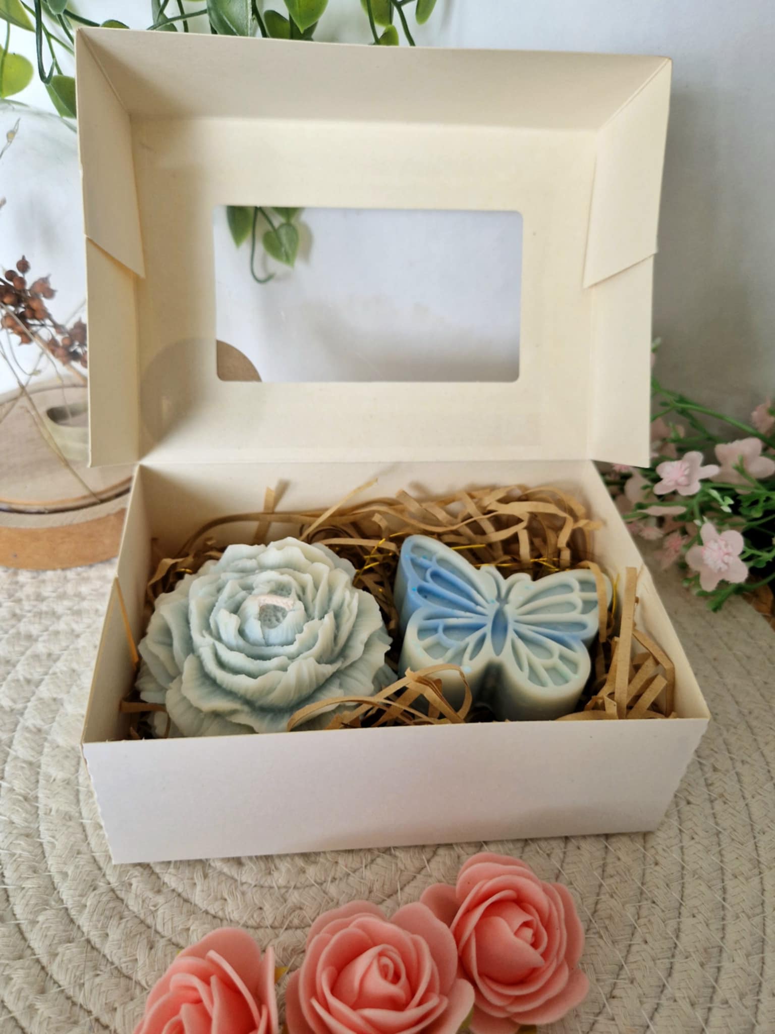 Ces deux merveilleux coffrets se composent d'une bougie papillon de +/- 50g et d'une bougie fleur de +/- 70g.