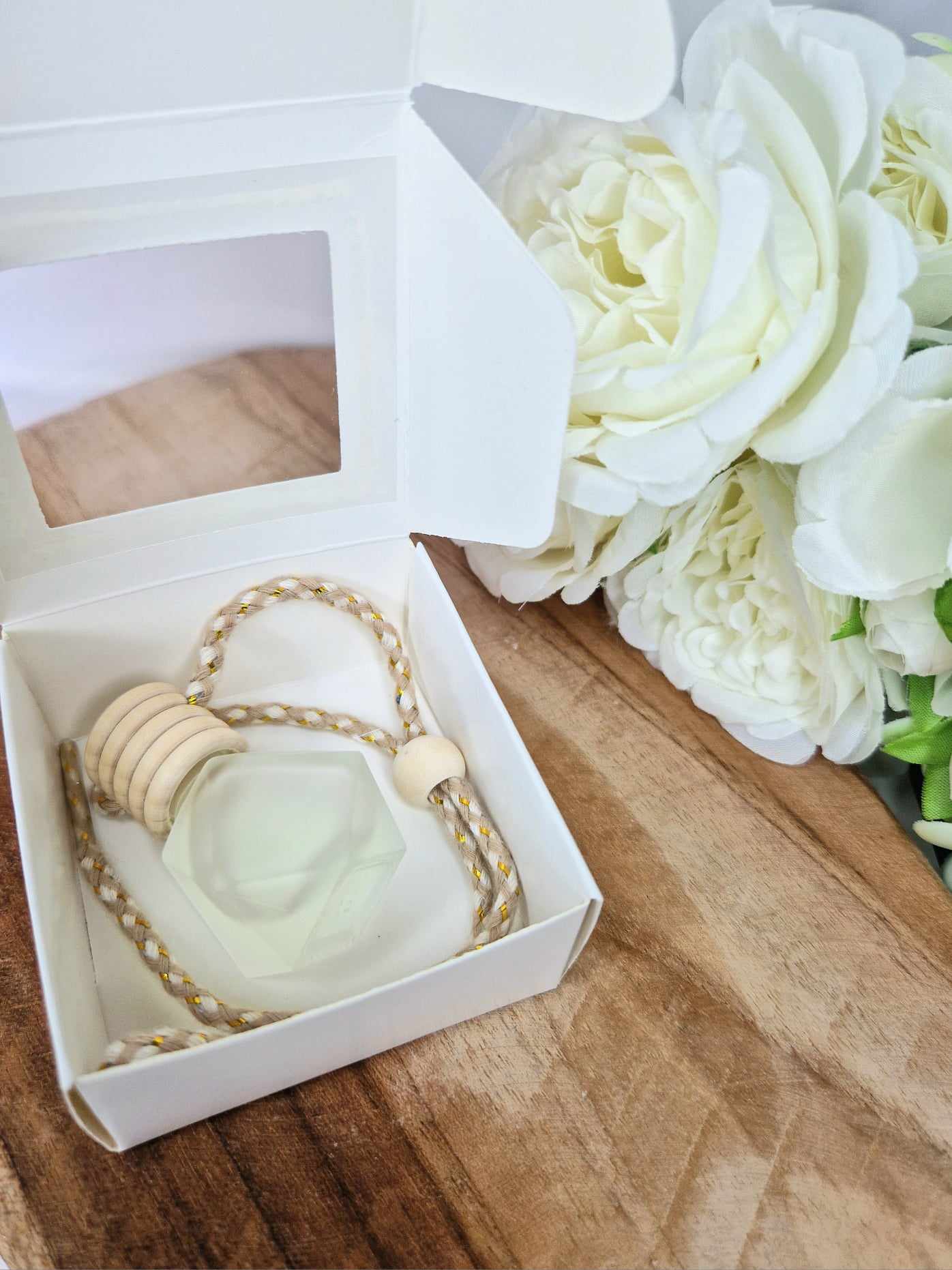 Ce diffuseur voiture est également en verre givré et celui-ci s'accrochera à votre rétroviseur central grâce à un magnifique cordon blanc et doré.