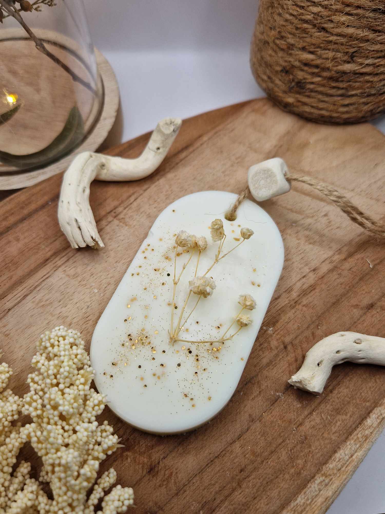 Tablette parfumée de +/- 40g. Elle sont composées de cire de soja végétale, de fleurs séchées et d'un petit cordon.